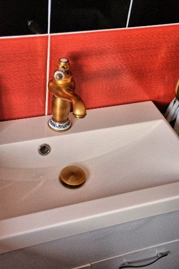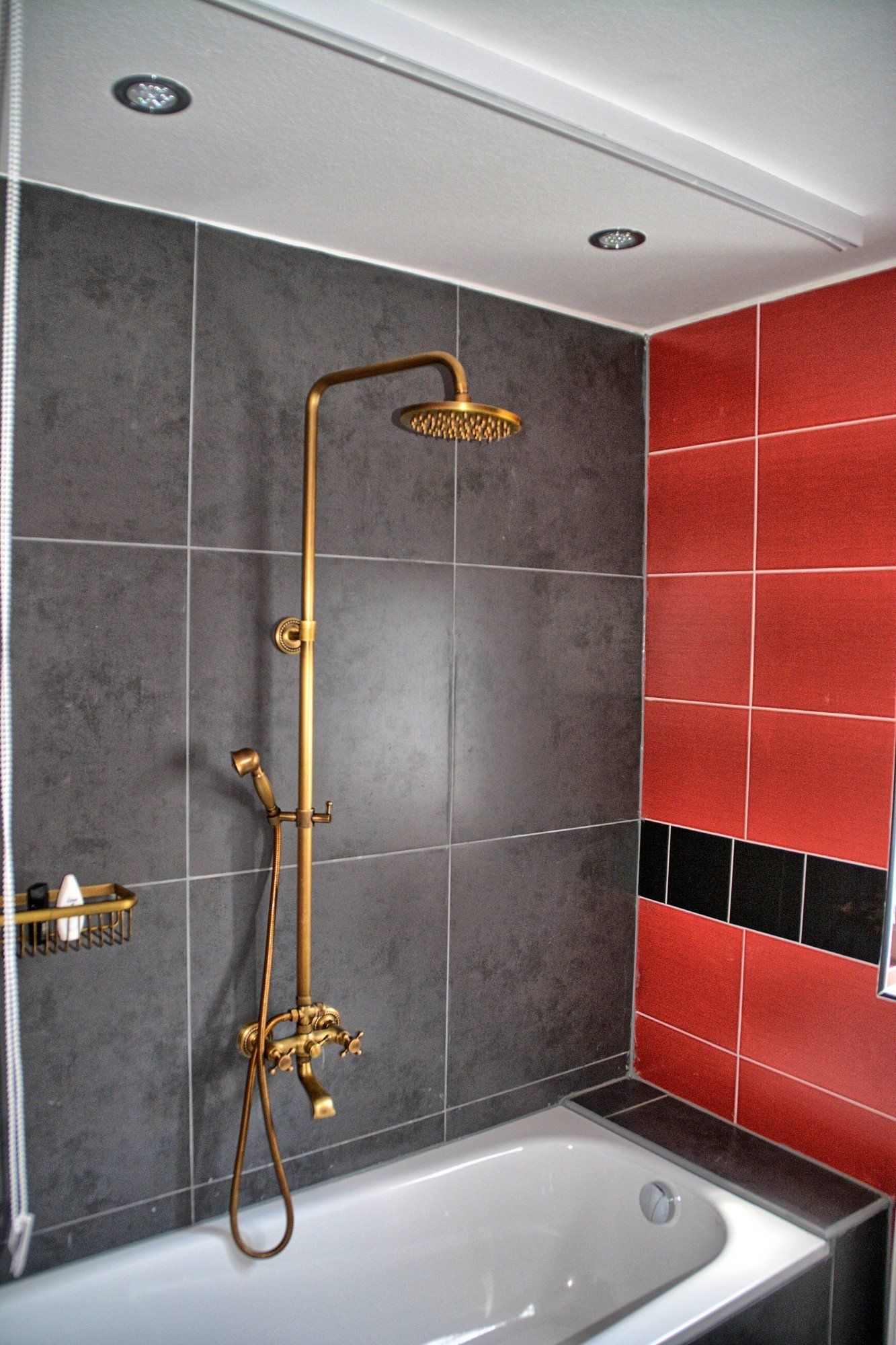 ein Wannenduschbad, eine Waschmachine, sowie eine Minibar.